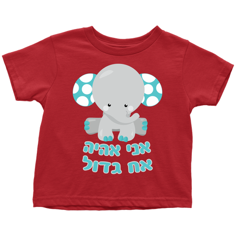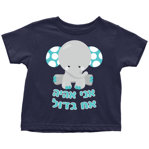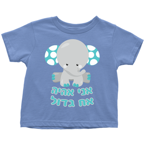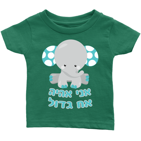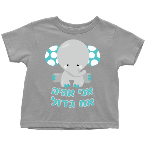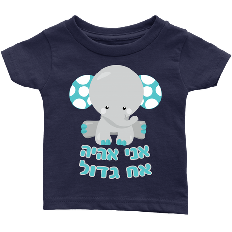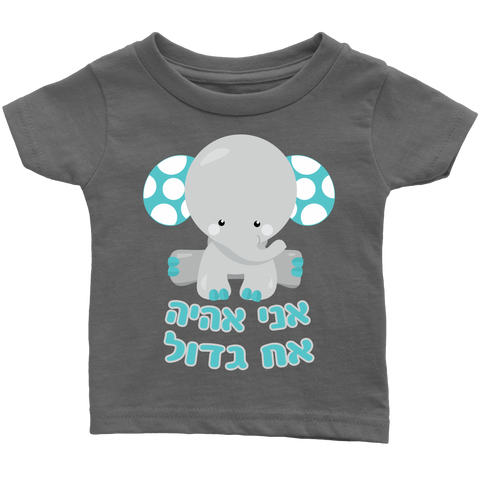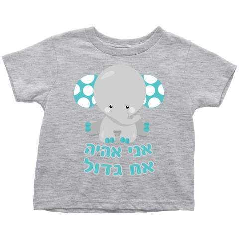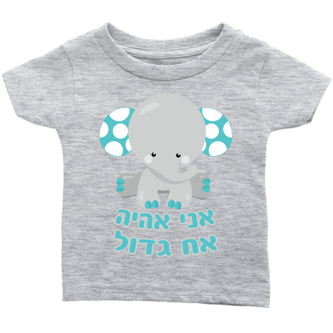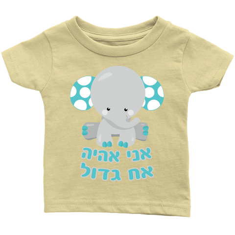 Features a cute elephant and the words: I Am Going To Be a Big Brother in Hebrew