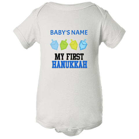 Adorable for Baby's First Hanukkah! This athletic print style first Hanukkah baby bodysuit is available in a variety of colors and sizes, features dancing dreidels and can be personalized with baby's name. Exclusively ours