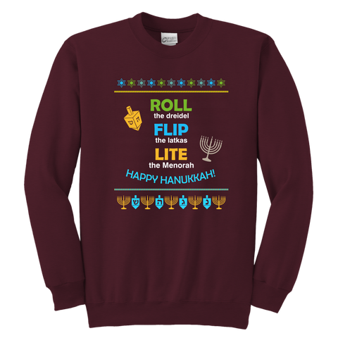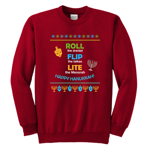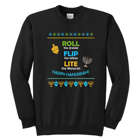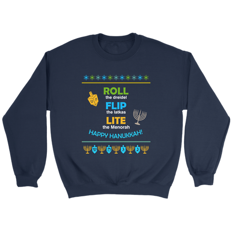 Listing the main activites of Hanukkah: dreidel, latkas and Menorah lighting and decorated with Magen Davids, Menorahs, Dreidels with the letters for Nes Gadol Haiya Sham - Great Miracle Happened There